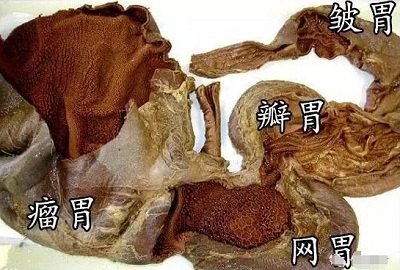 反芻動物采食一般比較匆忙,特別是粗飼料,大部分未經充分咀嚼就吞咽進入瘤胃,經過瘤胃浸泡和軟化一段時間后,食物經逆嘔重新回到口腔,經過再咀嚼,再次混入唾液并再吞咽進入瘤胃?梢允怯闪鑫钢苯幽鎳I上行至口,也可以從瘤胃陸續進入網胃,再由網胃返回口中,經口腔中頰齒的細細咀嚼后再次咽回瘤胃。這一反芻和咀嚼過程可以再次重復進行,直至徹底嚼碎后,食物再從瘤胃經網胃而入瓣胃。瓣胃近球形,內壁有許多平行的葉片(故俗稱百葉)。瓣胃的葉片提供廣大的面積,食糜在葉片間受到壓擠,使成更細碎的食糜,同時,瓣胃也吸收一部分水和低級脂肪酸。皺胃是唯一分泌消化液的部分,相當于其它獸類的胃本體,胃腺的分泌物中含有胃蛋白酶和鹽酸 。