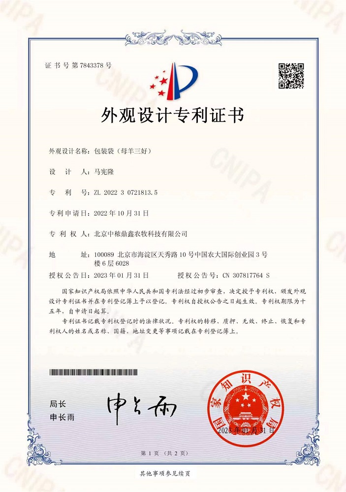 母羊三好外觀設(shè)計(jì)專利證書(shū)